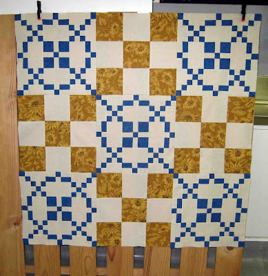 The leftovers after constructing the B Blocks - I was one set short and had to cut another strip. Hopefully I have enough sunflower fabric left for the borders. All the fabric calculations were done on a spreadsheet, but I still have to convert imperial measurements to metric - yards to metres, inches to centimeters etc, so maybe this accounted for some of the inaccuracies in my calculations. Or maybe I just got it wrong and need more practice!