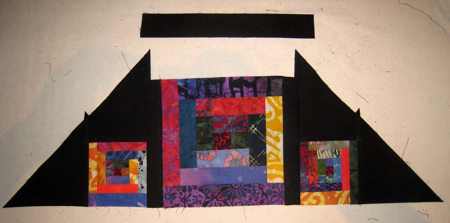 I don't like the quilting design I chose to test. The fabrics and batting are both cottons and have shrunk considerably, which I normally prefer, but too much texture doesn't suit this quilt. Nor do I like the variegated thread. For the quilting, Julie and I have chosen to do simple scallops (which Julie calls rainbows), use invisible nylon on top and the variegated thread in the bottom, which should show up well on the black batting.